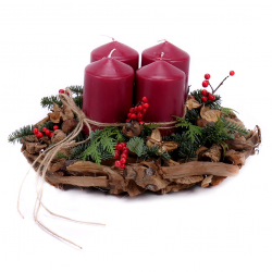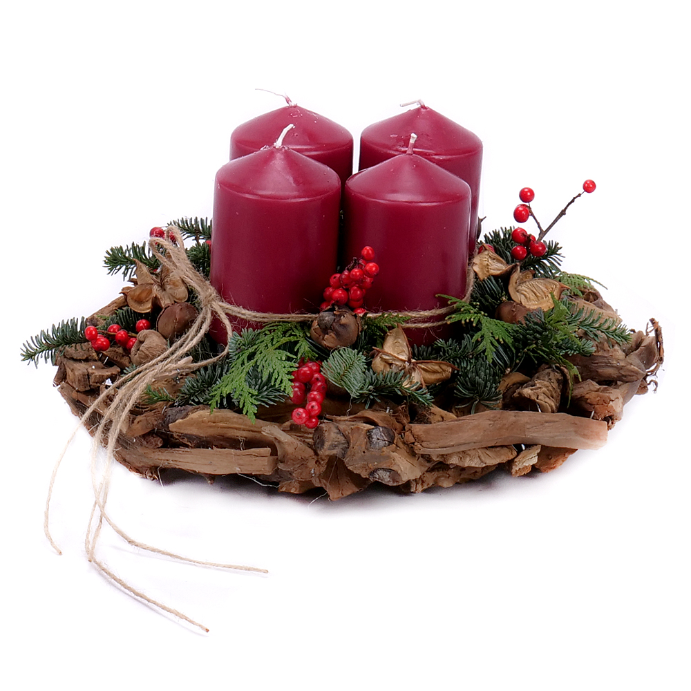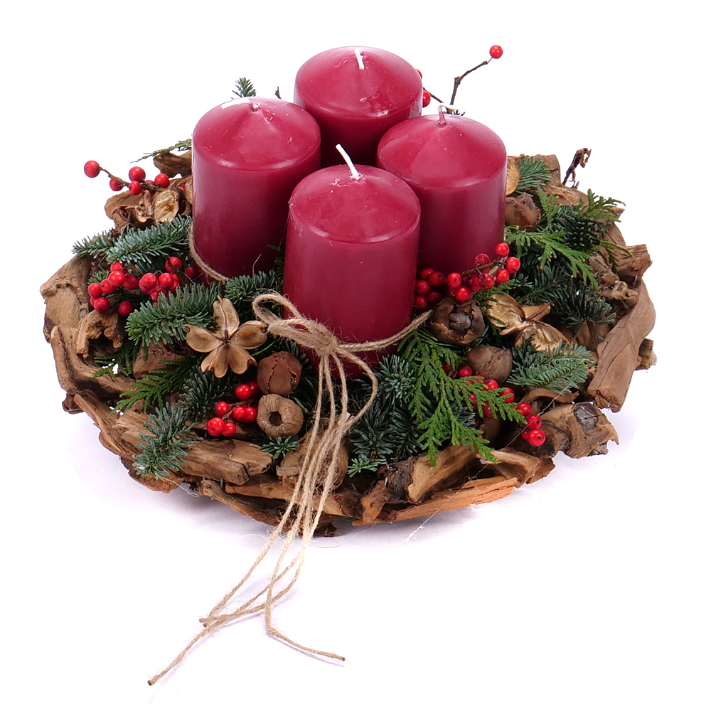 Adventný veniec na drevenom podklade so živou čačinou, prírodnými doplnkami a sviečkami bordovej farby - 4 ks.