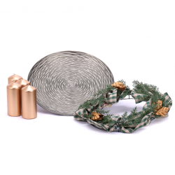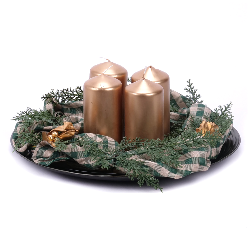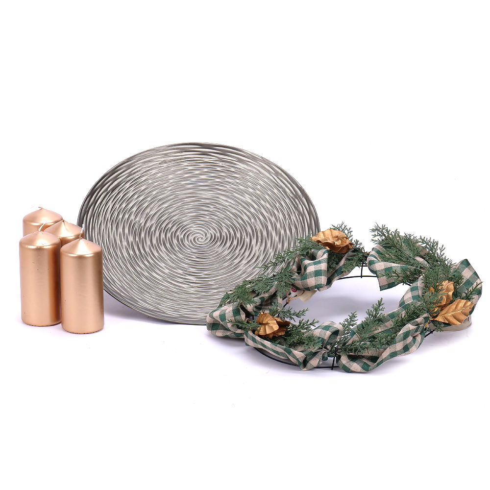 Umelý veniec na kovovom podklade. Súčasťou sú 4 ks zlatých sviečok a plastový dekoračný podnos pod veniec. Veniec môže slúžiť aj na zavesenie alebo položenie ako dekorácia.