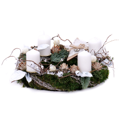 Adventný svietnik s bielymi sviečkami, prírodnými doplnkami a drevenými vianočnými dekoráciami. Podklad aranžmánu tvorí machový veniec. Sviečky - 4 ks sú súčasťou venca.