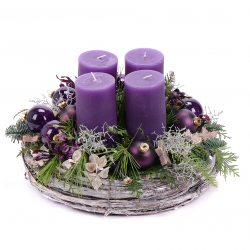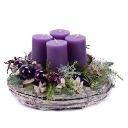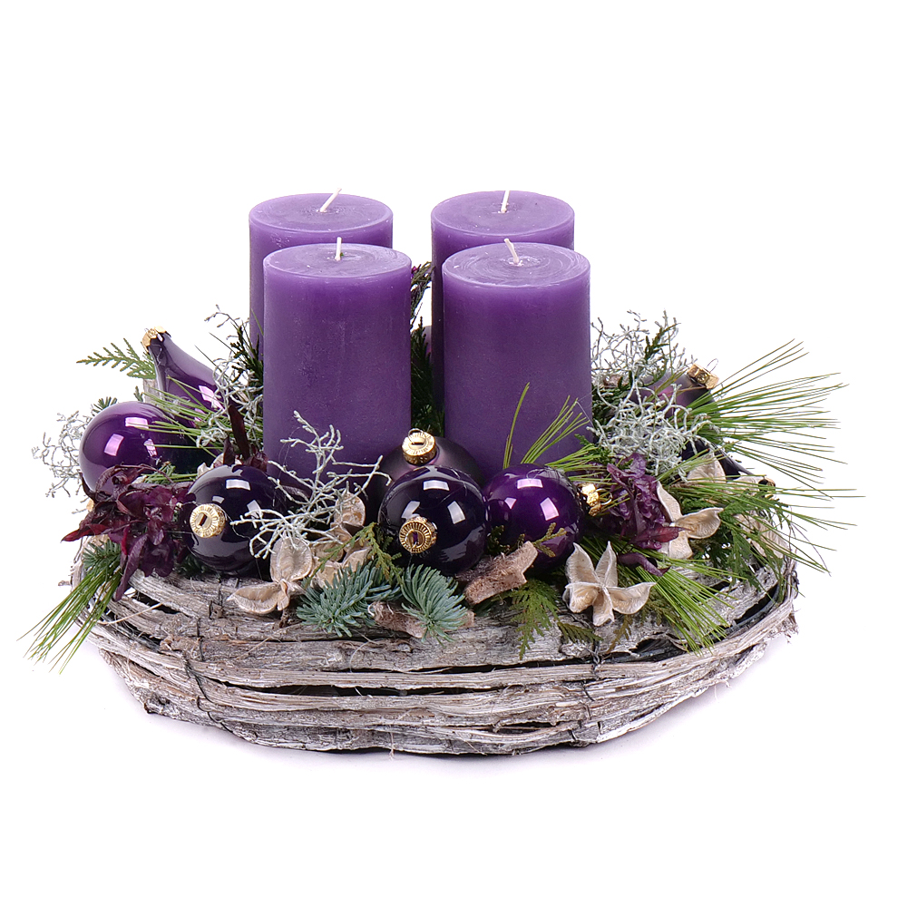 Adventný prútený veniec s prírodnými doplnkami, živou čačinou, vianočnými guľami a vianočnými ozdobami. Súčasťou sú 4 ks sviečok fialovej farby.