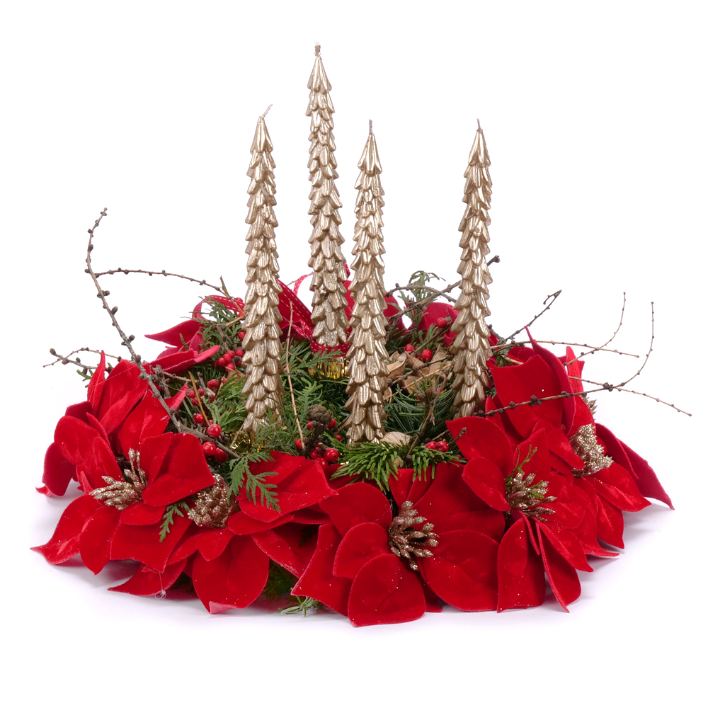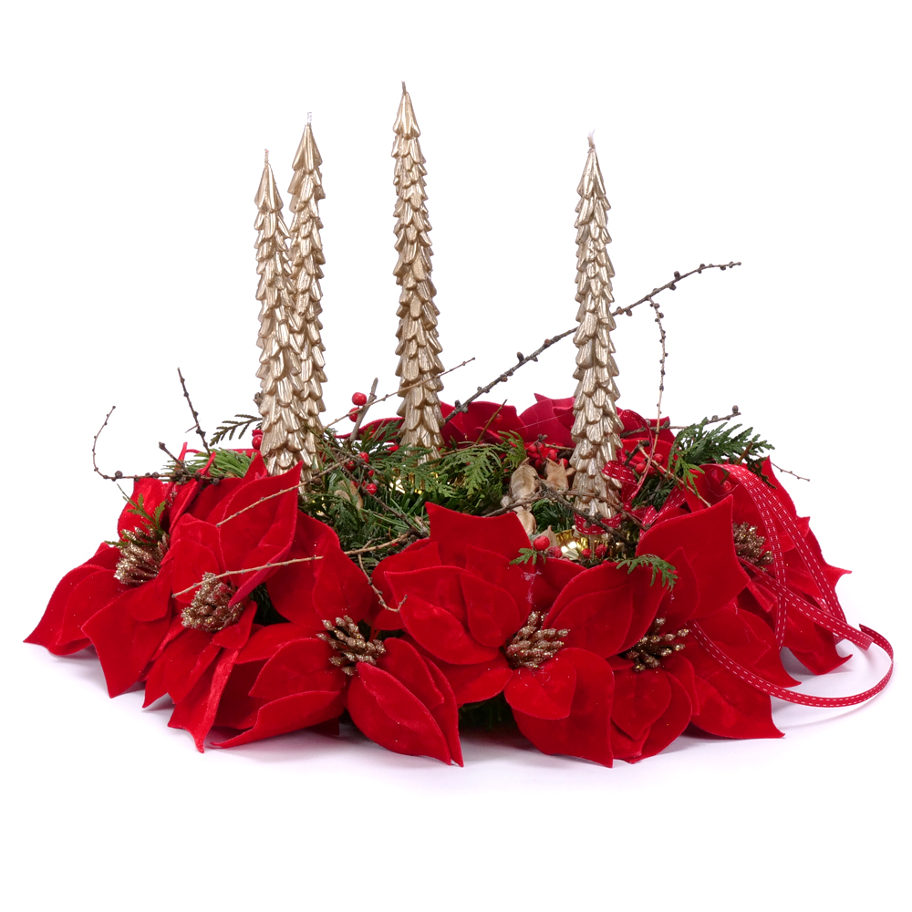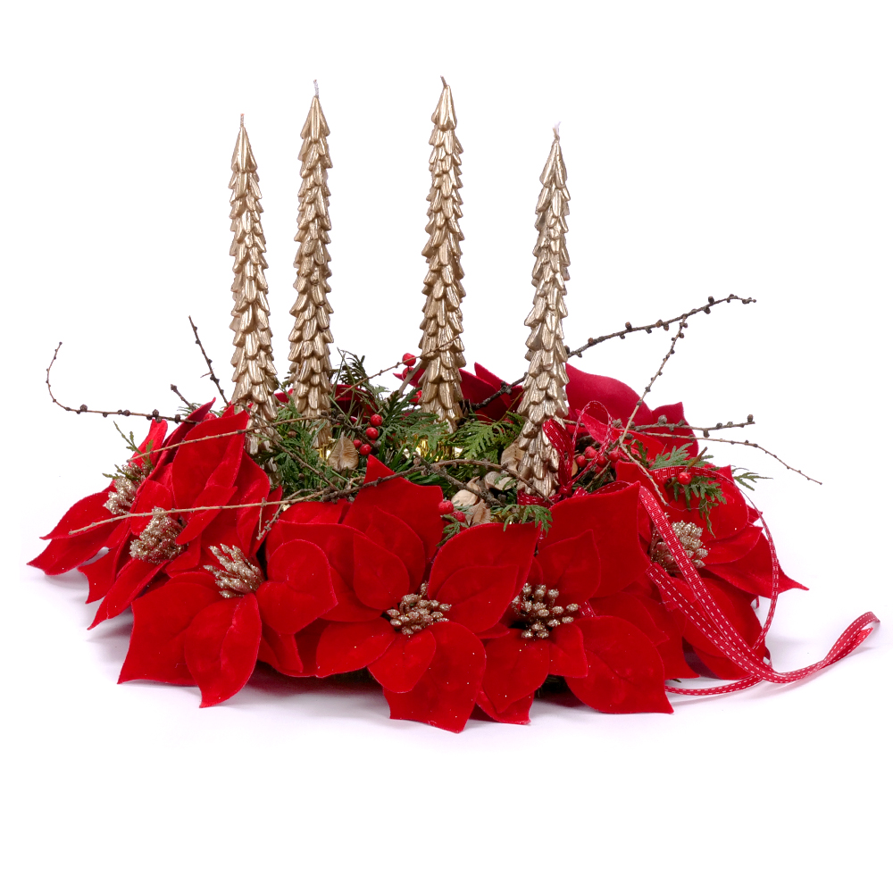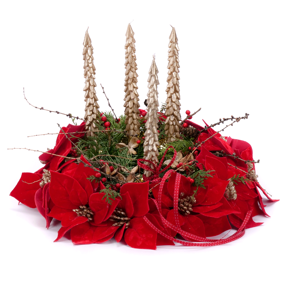 Adventný svietnik zo živej čačiny, prírodných doplnkov a ilexu. Veniec je doplnený vianočnými umelými ružami červenej farby. Súčasťou sú 4 ks kónických sviečok v tvare stromčeka zlatej farby. Venec je elegantný, tradičný a pritom výnimočne pôsobivý doplnok, ktorý prinesie do vášho domova sviatočnú atmosféru.
