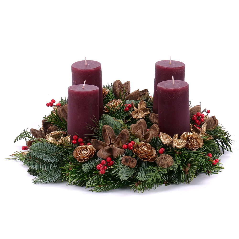 Adventný veniec zo živej čačiny červené sviečky zlaté doplnky
