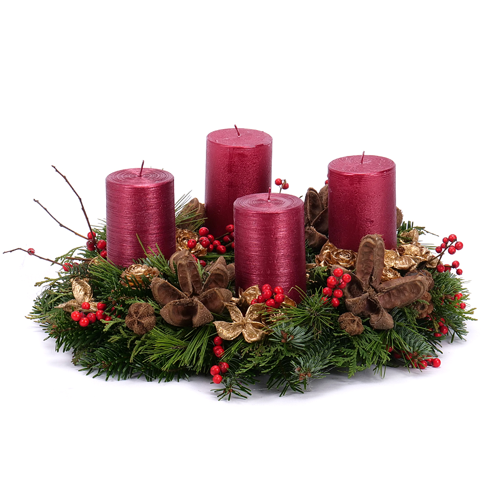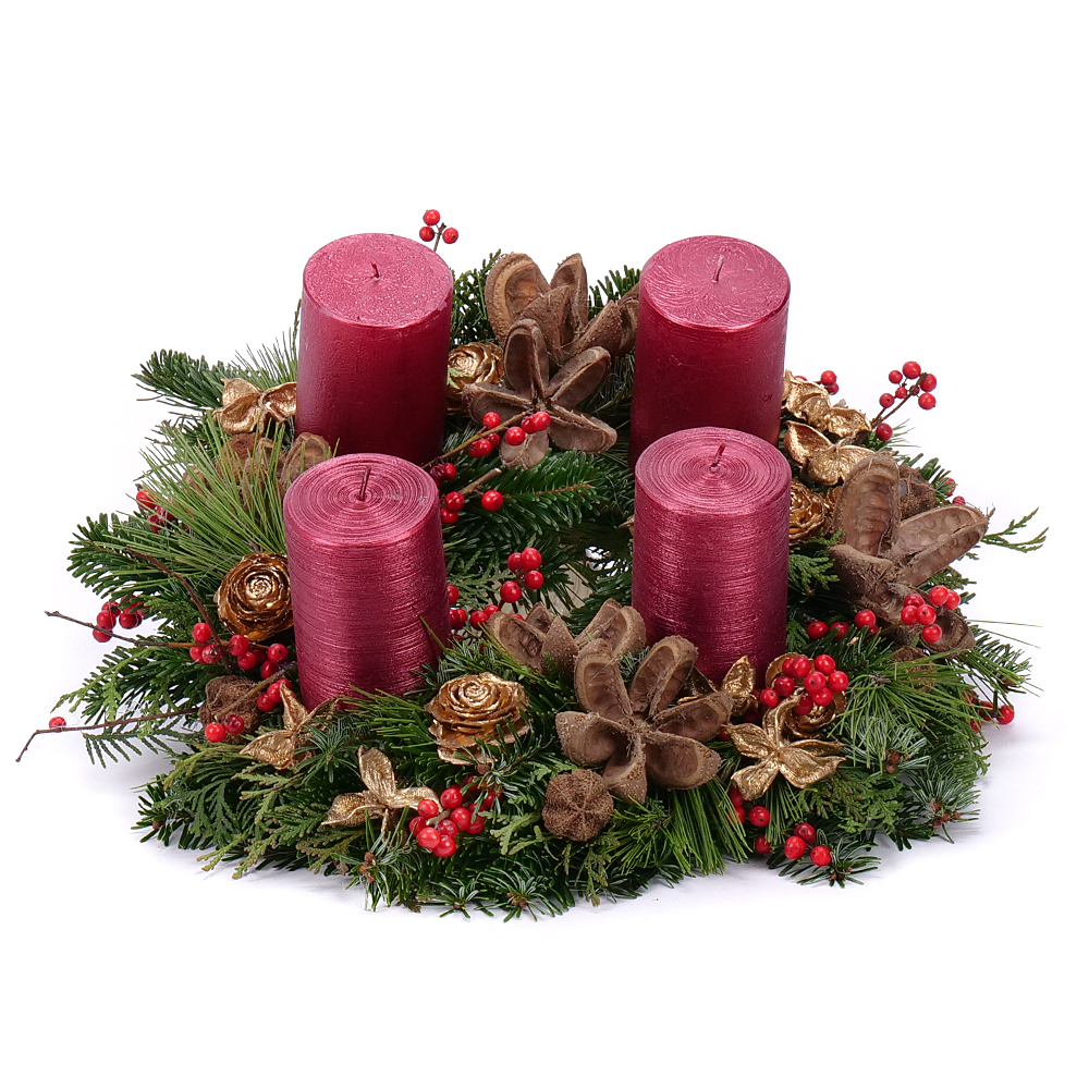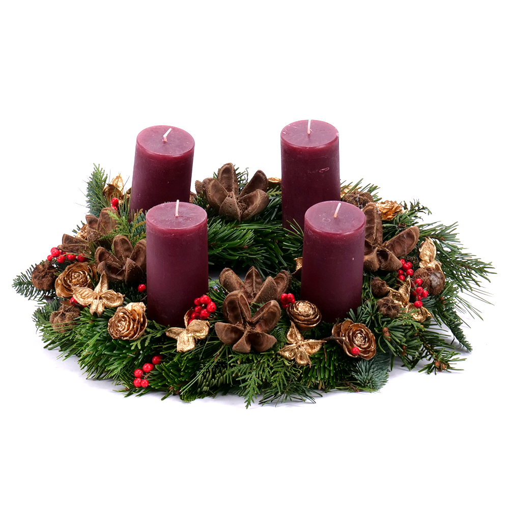 Veniec zo živej čačiny s prírodnými doplnkami a zlatými farbenými materiálmi. Súčasťou sú sviečky 4 ks. Vkusne skrášli Váš domov a pripomenie Vám príchod Vianoc v čase adventného obdobia.