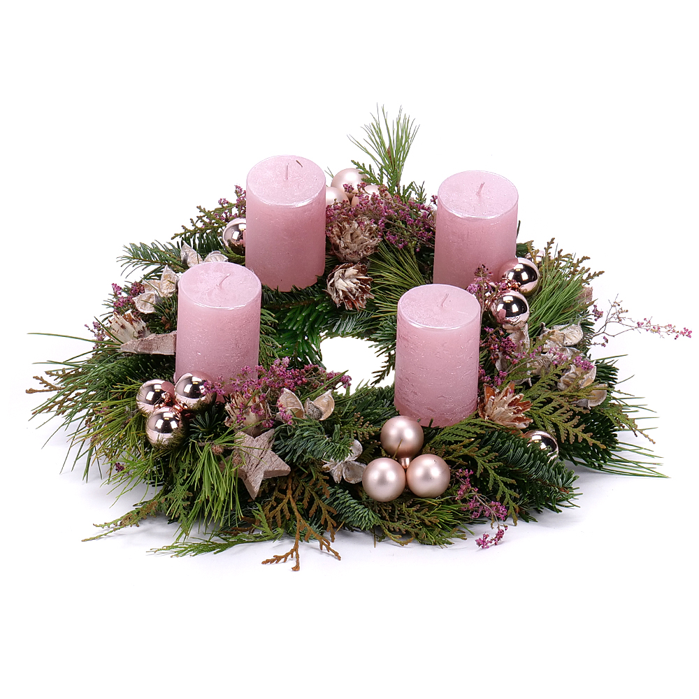 Adventný veniec zo živej čačiny s ružovými vianočnými doplnkami a ružovými sviecami - 4 ks.