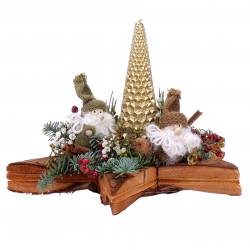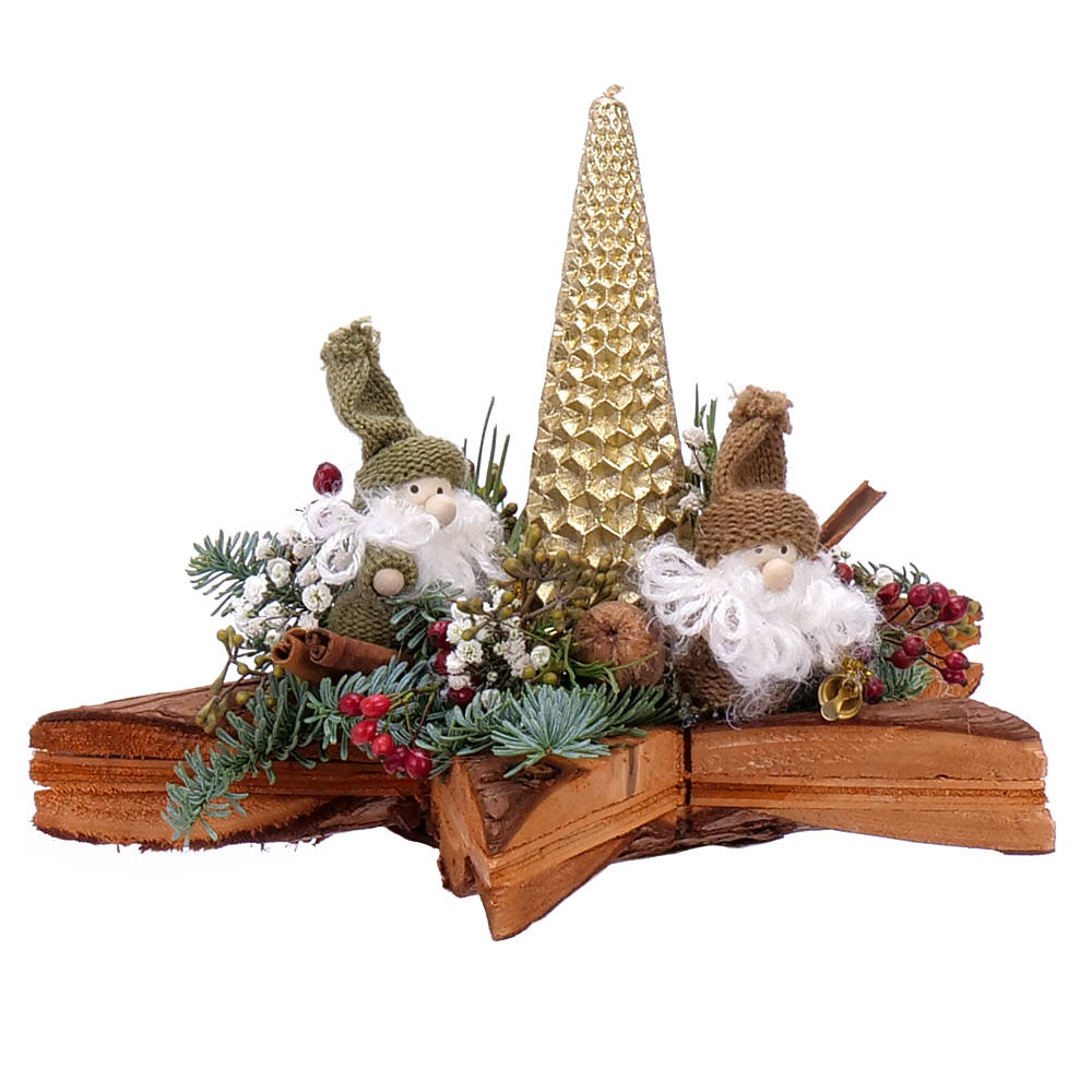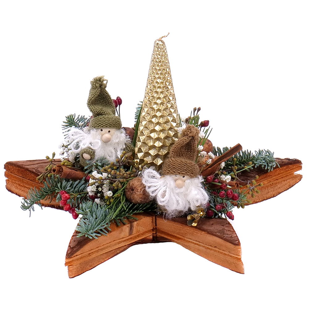 Prírodný aranžmán na drevenom podklade v tvare hviezdy so živou čačinou, prírodnými doplnkami a mini postavičkami Mikuláša. Súčasťou je sviečka v zlatej farbe.