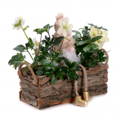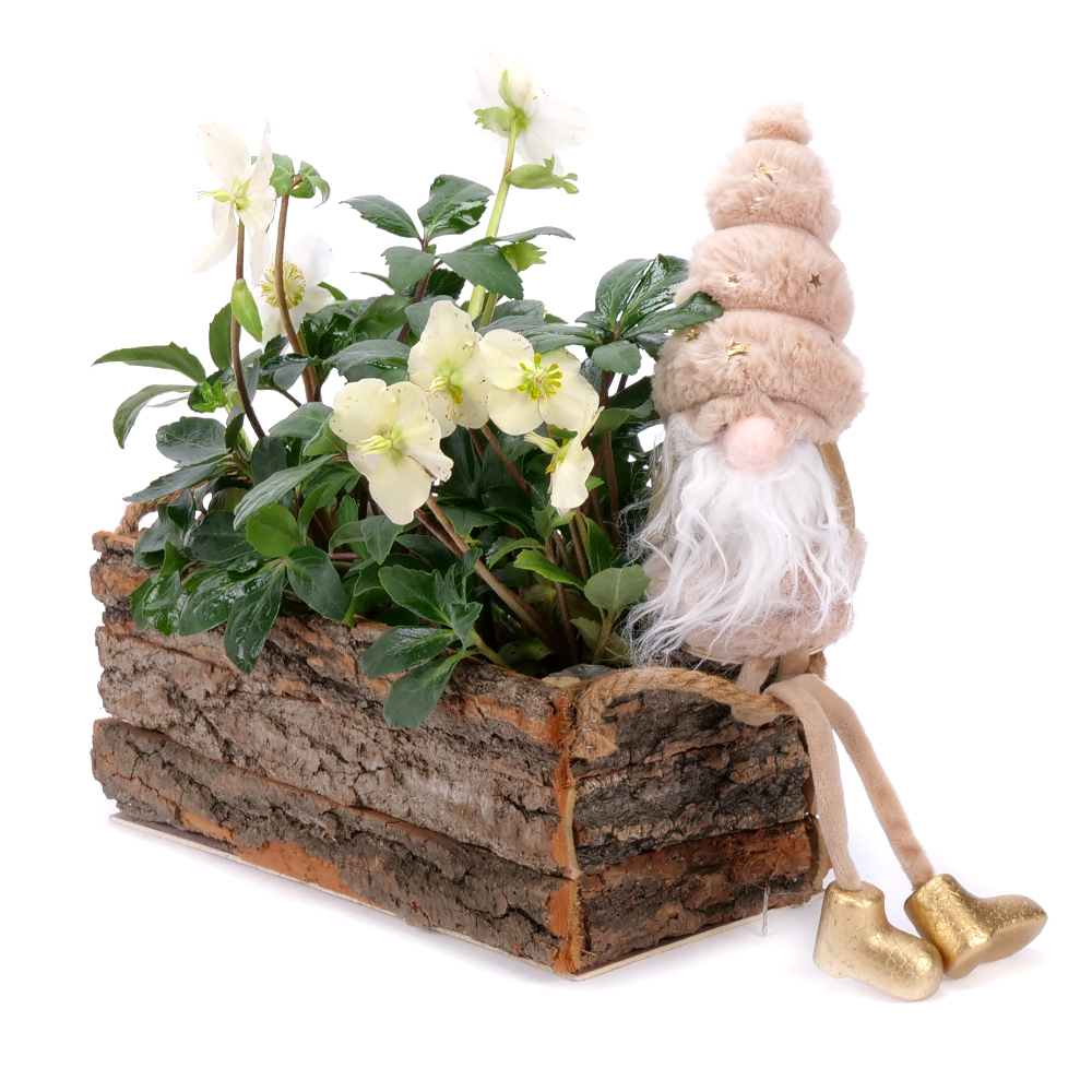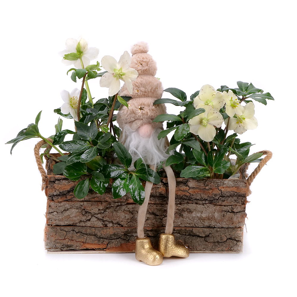 Živá črepníková čemerica - 2 ks v drevenom boxe s látkovým trpaslíkom, ktorý je súčasťou setu. Vhodný darček k sviatku alebo len tak ako dekorácia.