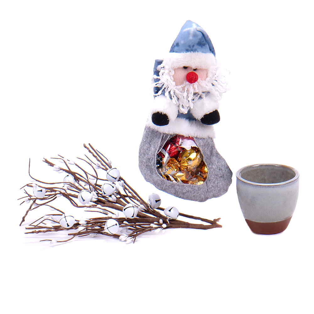 Darčekový set s Mikulášom, cukrovinkami, dekoračnou vianočnou vetvičkou s rolničkami a keramickým obalom.