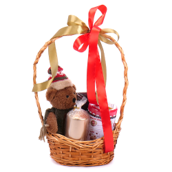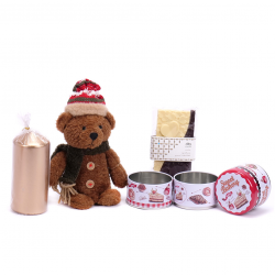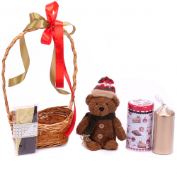 Vianočný set v prútenom košíku so saténovou stuhou, plyšovým vianočným medvedíkom, dekoračnou sviečkou, plechovou dózou a ručne robenou tabuľkovou čokoládou so sušeným ovocím. ... Viac