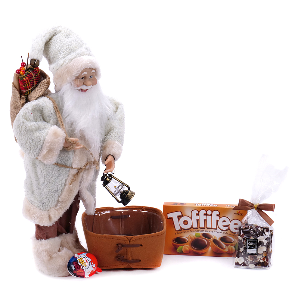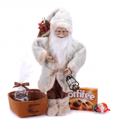 Darčekový set na Mikuláša s postavou Mikuláša, dezertom Toffifee - 1 ks, ručne robenou lámanou čokoládou - 1 ks a vajíčkom kinder joy - 1 ks.