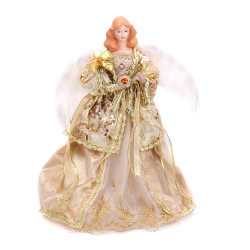 Vianočná látková postava anjela v zlatom oblečení. Vhodná dekorácia na stôl alebo aj na vrcholec stromčeka (vnútro anjela tvorí plastový kužel).