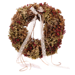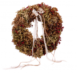 Dekoračný prírodný veniec zo sušenej hortenzie, prírodných materiálov a dekoračnej stuhy.