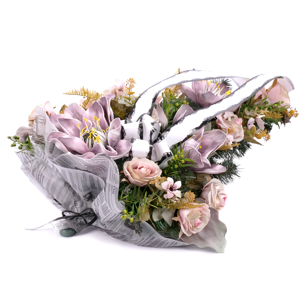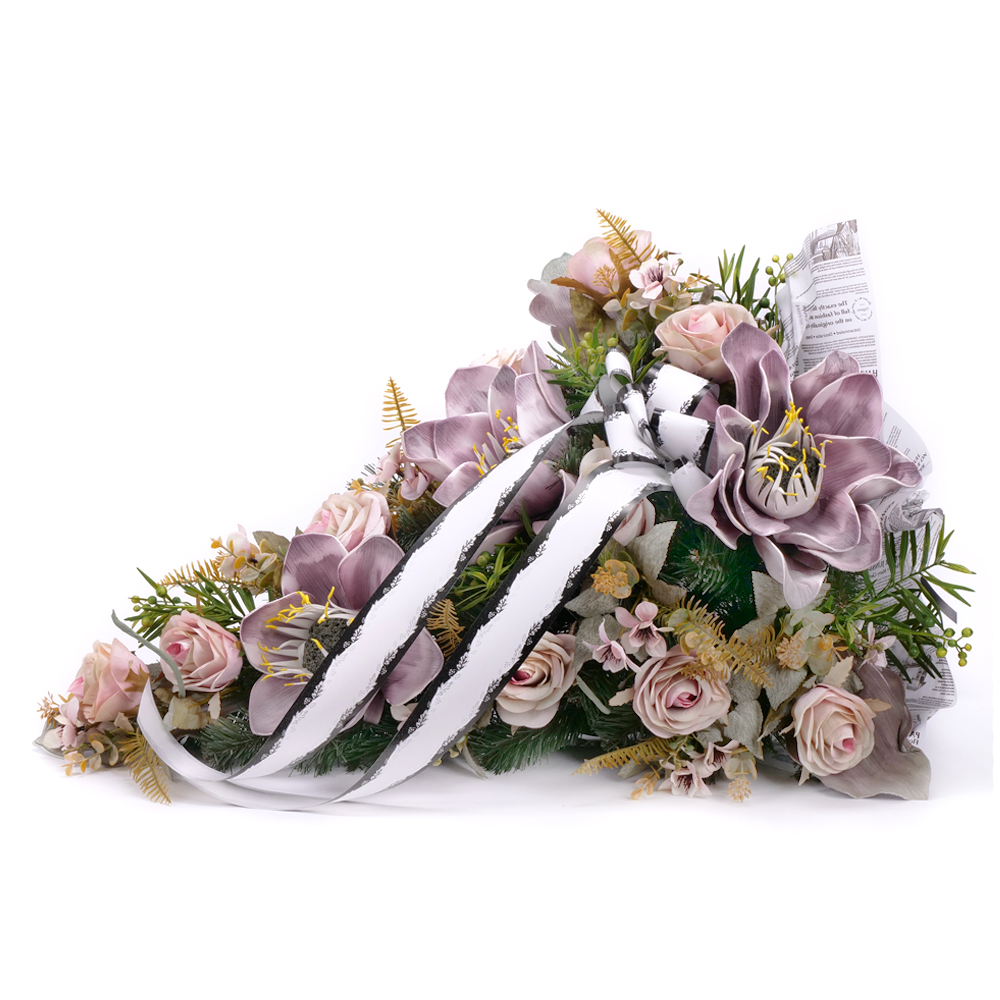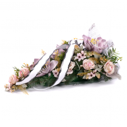 Smútočná kytica z umelých a penových kvetov v jemnej ružovo - fialovej farbe. Základ kytice tvorí podklad z umelej čačiny. Kytica je doplnená smútočným papierom a stuhou.