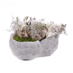 Aranžmán v zaťaženej mise z betónu v prírodnom prevedení s machom a sušenými plodmi.