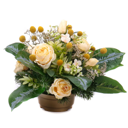 Smútočný aranžmán v zaťaženej miske z umelej čačiny v kombinácii s jemnými žltými umelými kvetmi a prírodnými doplnkami.