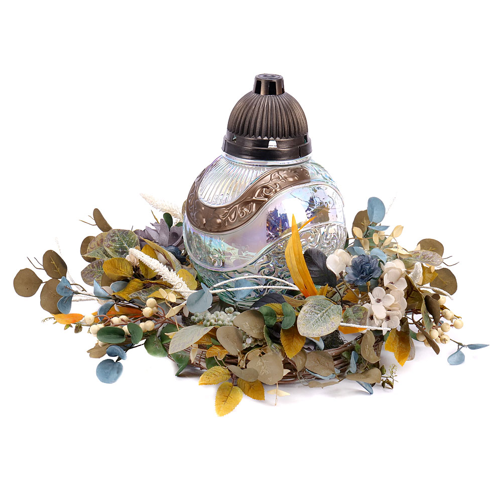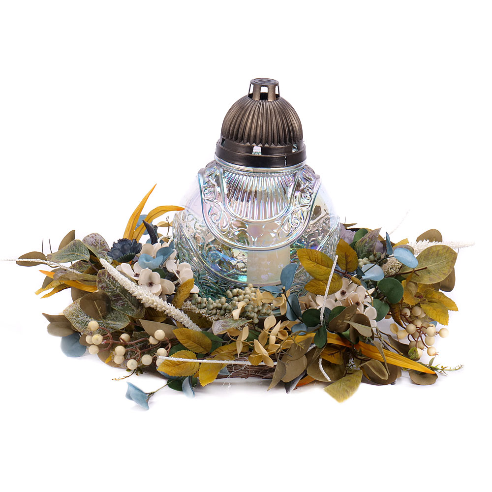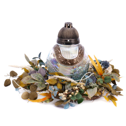 Elegantný smútočný veniec z kvalitných umelých kvetov a zelene, doplnený o sklenený kahanec umiestnený v jeho strede. Tento vkusný aranžmán symbolizuje večné svetlo spomienky a úcty k zosnulým. Kombinácia kvetov, prírodne pôsobiacej zelene a svetla kahanca vytvára dôstojnú a harmonickú kompozíciu. Veniec je vhodný ako celoročná dekorácia na hrob alebo pietne miesto – vďaka trvácnym materiálom si zachová svoj tvar aj farby počas dlhého obdobia.