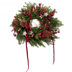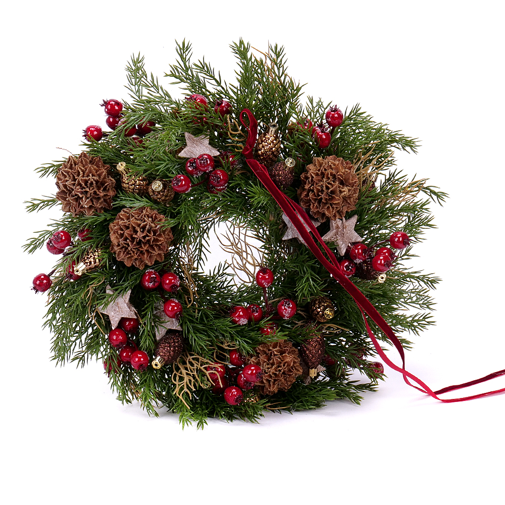 Veniec z umelej čačiny na zavesenie alebo položenie na stôl. Veniec je doplnený o prírodný materiál, drevené hviezdy a umelé dekorácie so stuhou.