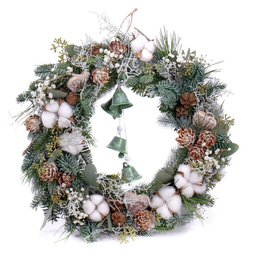 Umelý veniec v bielo - zelenom prevedení, doplnený o živú neopadavú čačinu s prírodnými doplnkami. Veniec je vhodný na zavesenie. Súčasťou sú zelené zvončeky uprostred venca.