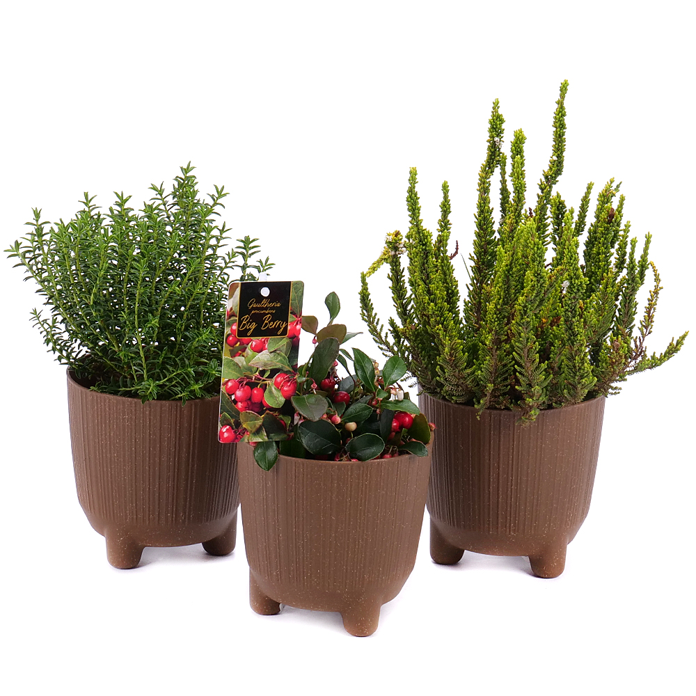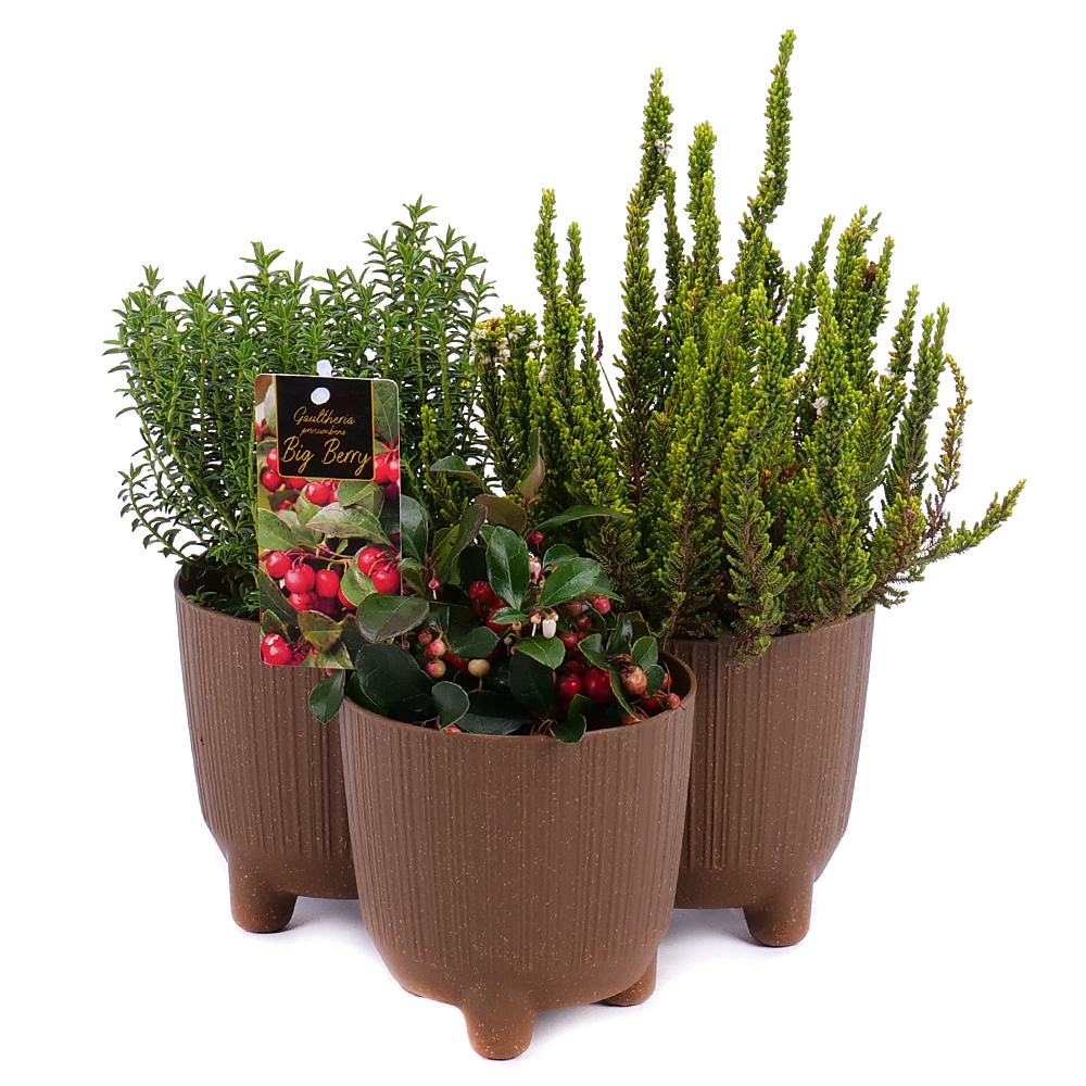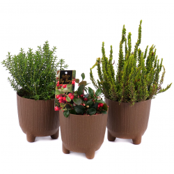 Tri rôzne druhy jesenných rastlín - hebe - 1 ks, vres - 1 ks a gaultheria - 1 ks. Súčasťou sú plastové obaly na črepníky v hnedej farbe - 3 ks. ... Viac