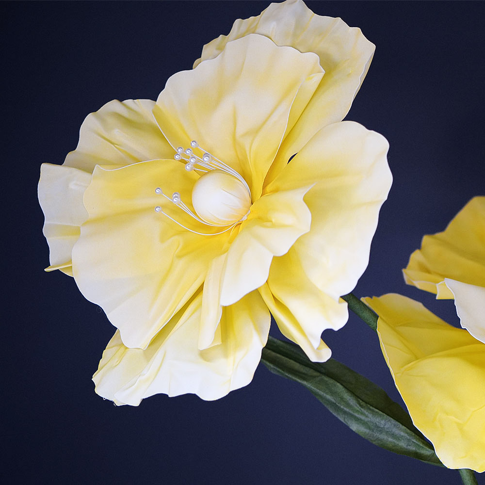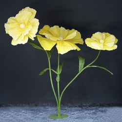 Elegantná dekorácia v podobe troch veľkých umelých - penových kvetov v žltej farbe, umiestnených na stabilnom kovovom stojane s výškou 120 cm. Tento nadčasový prvok pôsobí romanticky, vzdušne a zároveň moderne. Vďaka svojej výške a výraznému dizajnu sa stane nepriehliadnuteľnou dominantou každého interiéru, svadobnej výzdoby alebo výkladu.