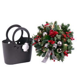 Zimná sviatočná kytica zo živej čačiny s červeným amarylisom, vianočnými doplnkami, dekoračnou zeleňou a mašlou. Súčasťou je plastová taška šedej farby.
