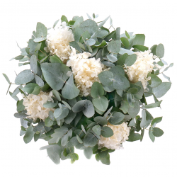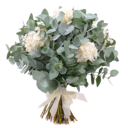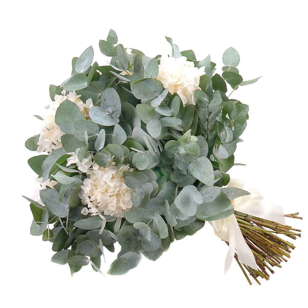Jemná kytica spája svieži eukalyptus s preparovanou bielou hortenziou – symbolom čistoty, elegancie a nadčasovej krásy. Biela hortenzia pôsobí vzdušne a ušľachtilo, zatiaľ čo eukalyptus dodáva kytici štruktúru, prírodný charakter a jemnú vôňu. Saténová stuha celok uzatvára v decentnom a vkusnom prevedení.