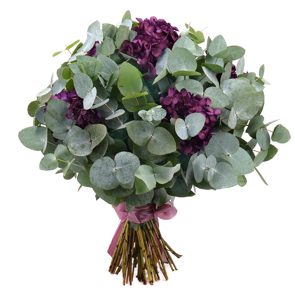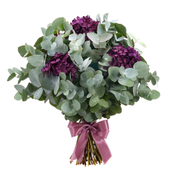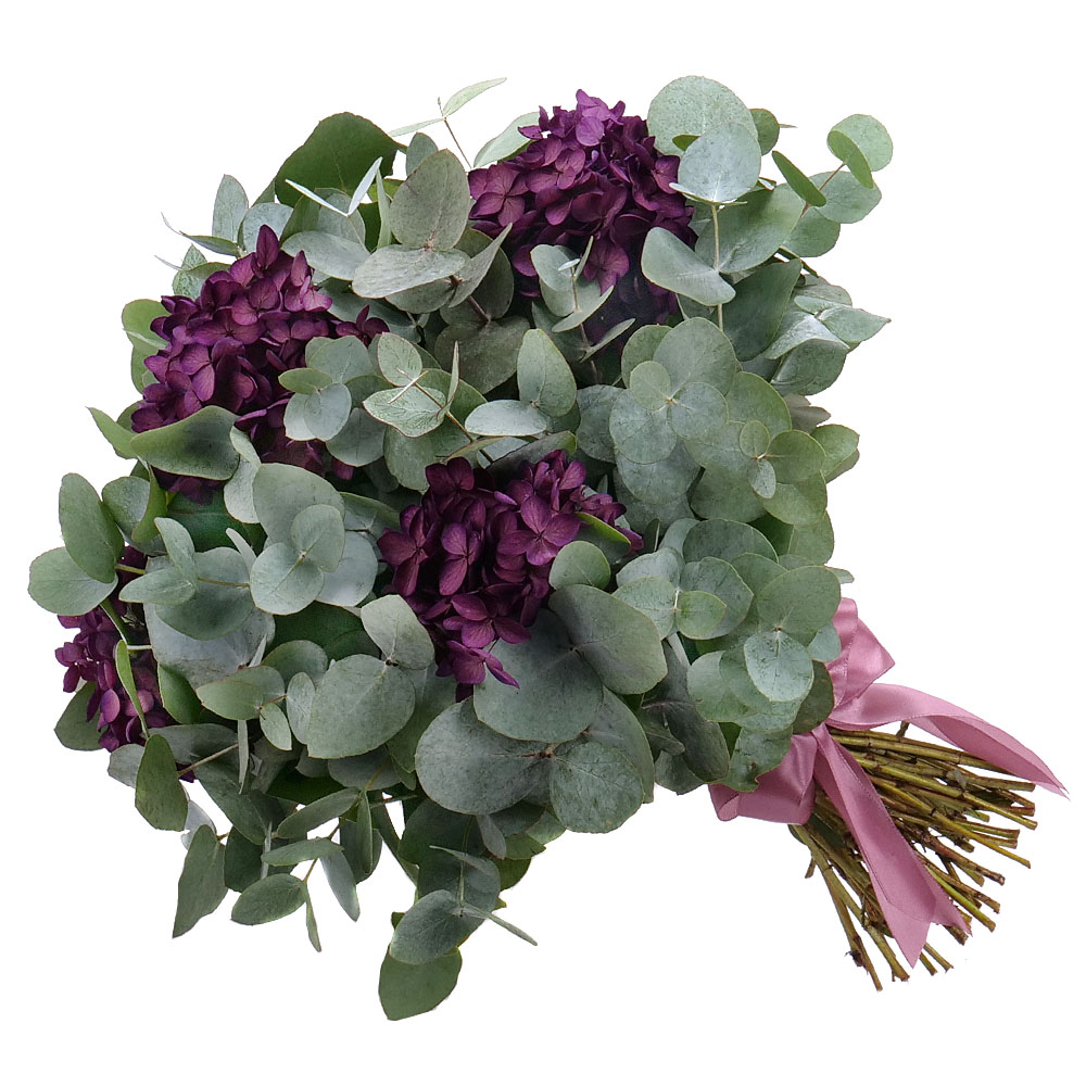 Výrazná kytica spája sviežosť živého eukalyptu s tajomnou krásou preparovanej hortenzie v tmavofialovom odtieni. Hortenzia pôsobí hlboko, zmyselne a noblesne, zatiaľ čo eukalyptus vnáša do celku jemnosť a prirodzený pohyb. Saténová stuha dodáva kytici finálny dotyk luxusu a zladenosti.