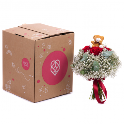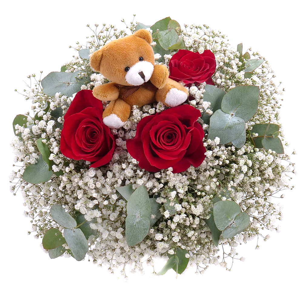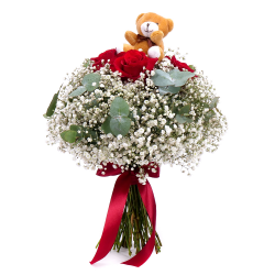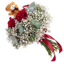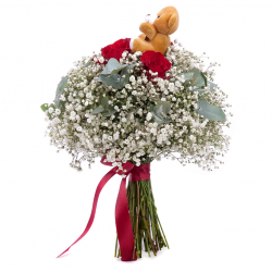Veselá kytica pre chlapčeka s malým plyšovým mackom, ružami červenej farby, gypsophilou a dekoračnou zeleňou. Vhodný darček k sviatku alebo len tak pre potešenie našich najmenších.