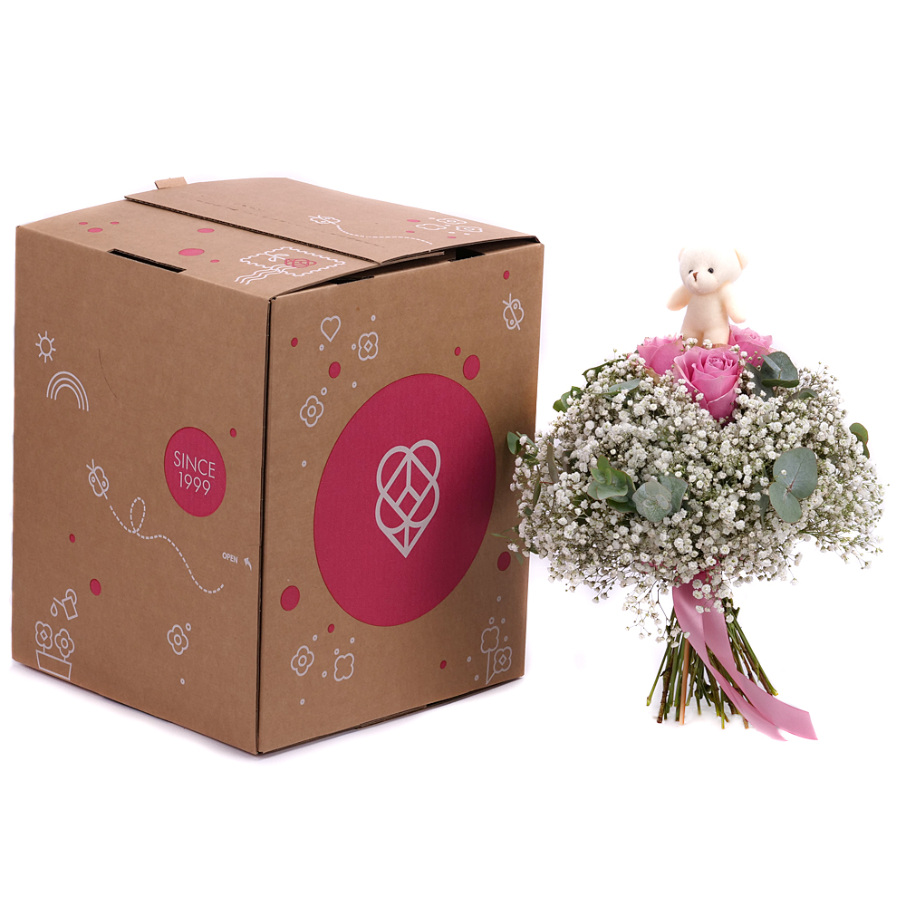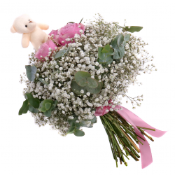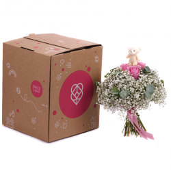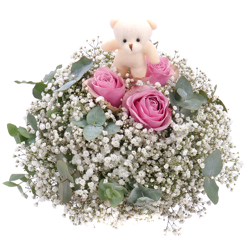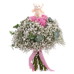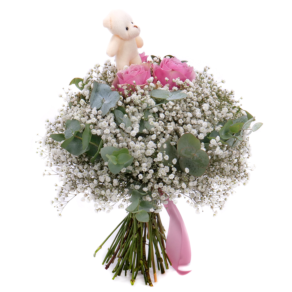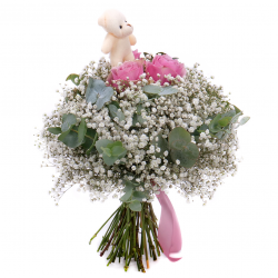Veselá kytica pre dievčatko s malým plyšovým mackom, ružami jemnej ružovej farby, gypsophilou a dekoračnou zeleňou. Vhodný darček k sviatku alebo len tak pre potešenie našich najmenších.