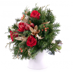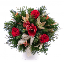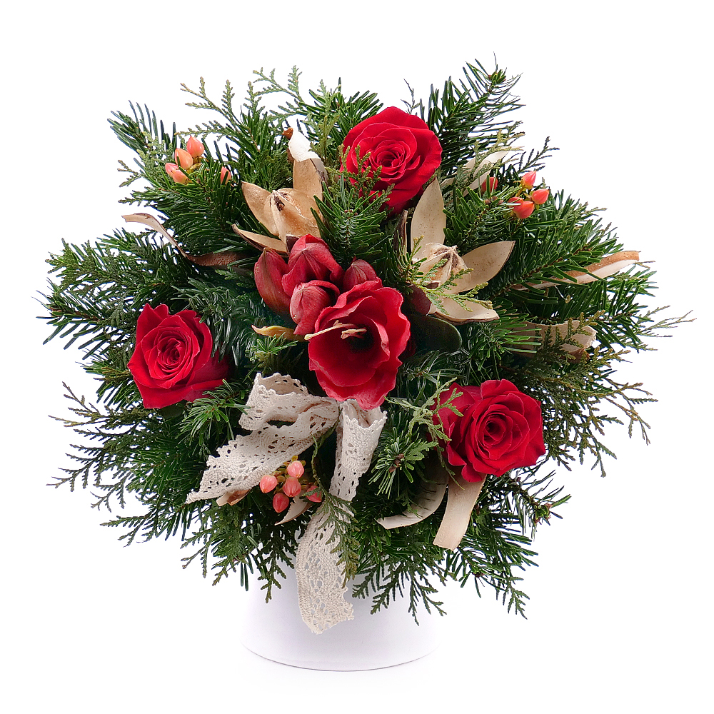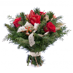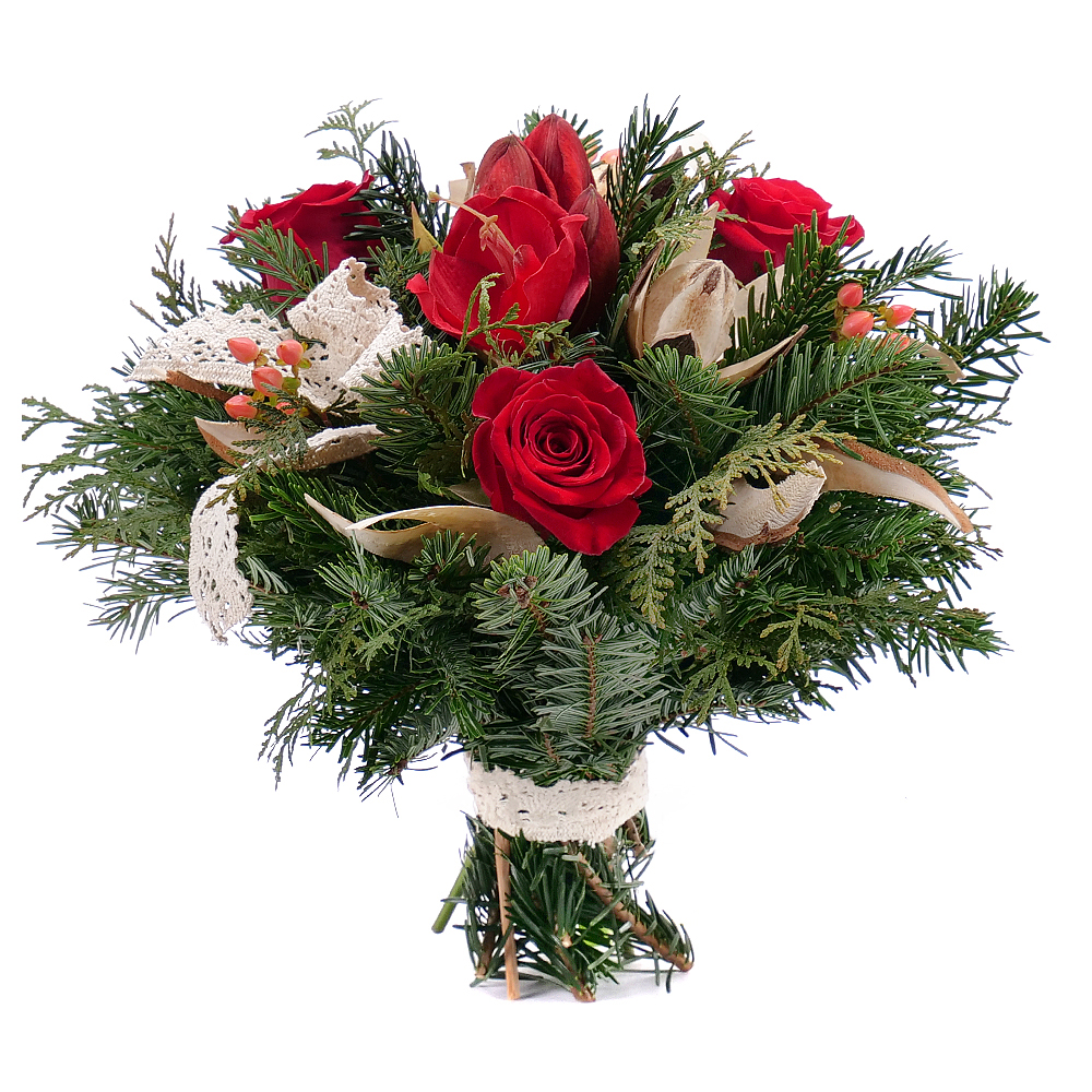 Zimná kytica z prírodných a sušených doplnkov s rezanými červenými ružami, amarylisom a dekoračnou stuhou.