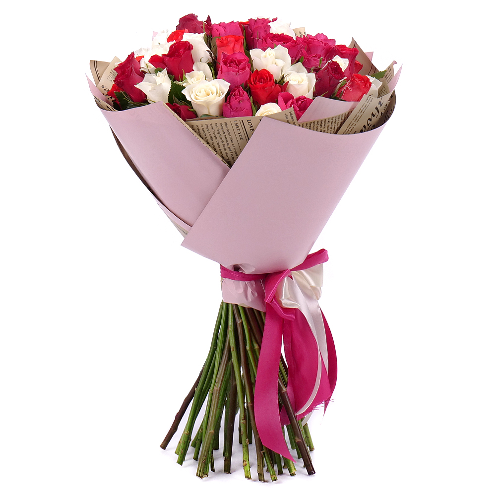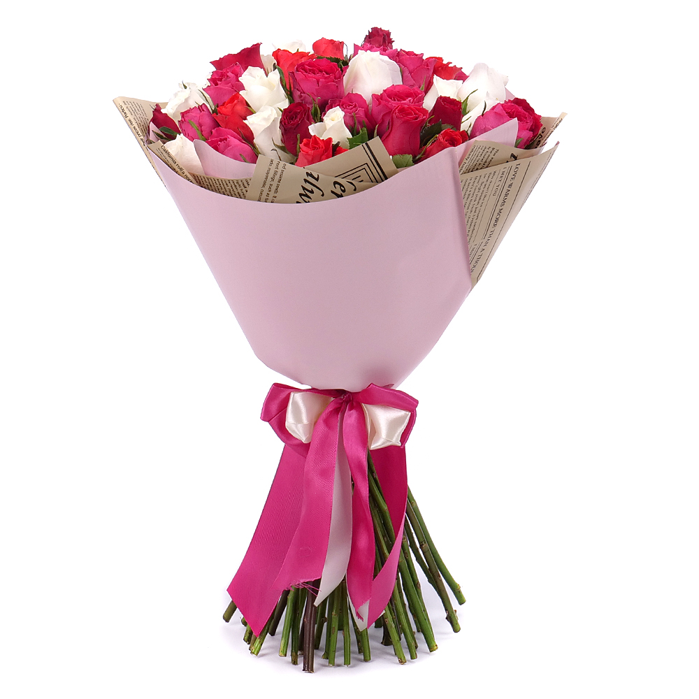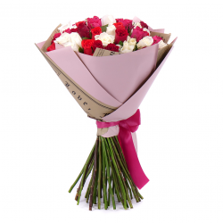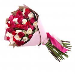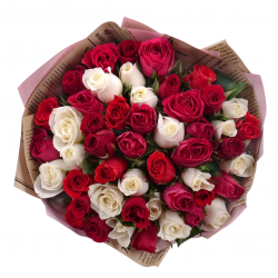 Kytica z červeno - cyklamenových a bielych ruží v dekoračnom papieri so saténovou stuhou. Vhodný darček k sviatku alebo len tak pre potešenie. Kytica je zložená z 49 ks ruží rôznych odtieňov červenej, ružovej a cyklamenovej.