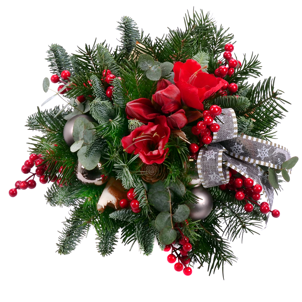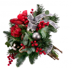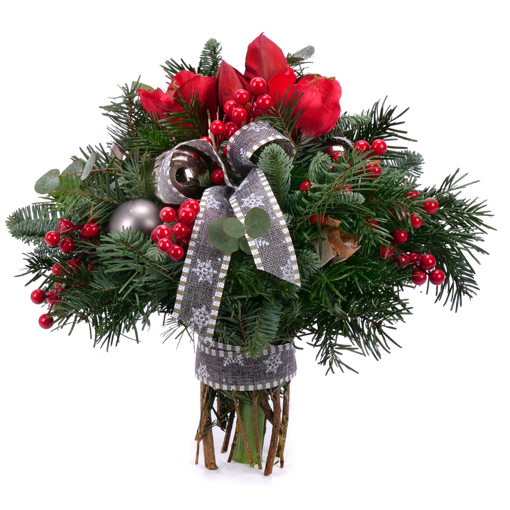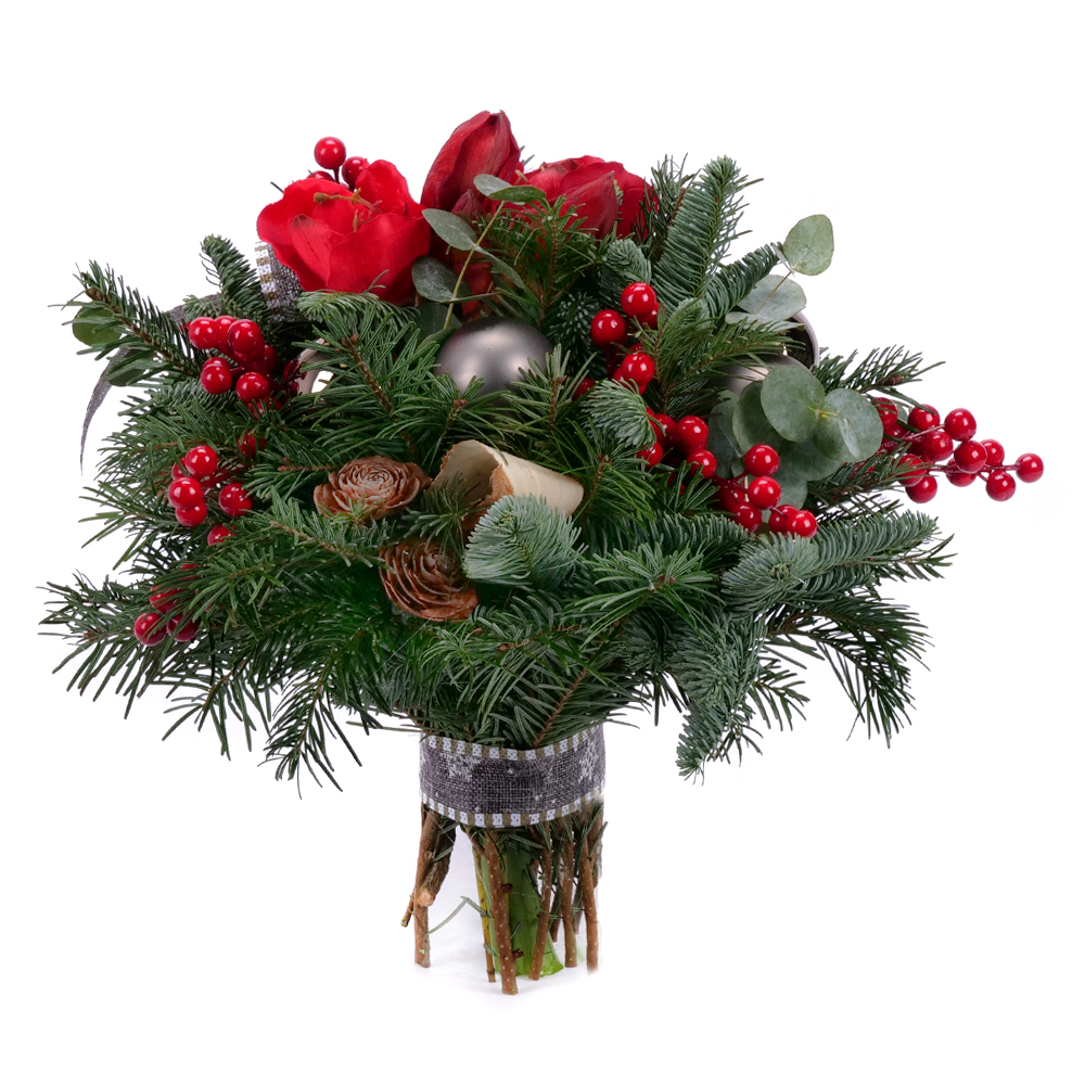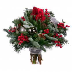 Zimná kytica s červeným amarylisom, živou čačinou, dekoračnou zeleňou, vianočnými guľami a prírodnými materiálmi. Kytica je doplnená dekoračnou stuhou. Vhodný darček k vianočným sviatkom a tiež vhodná dekorácia vianočného stola.