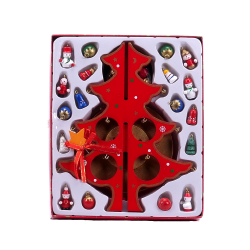 Vianočná dekorácia v podobe hracieho dreveného vianočného stromčeka s mini ozdobami na zavesenie.