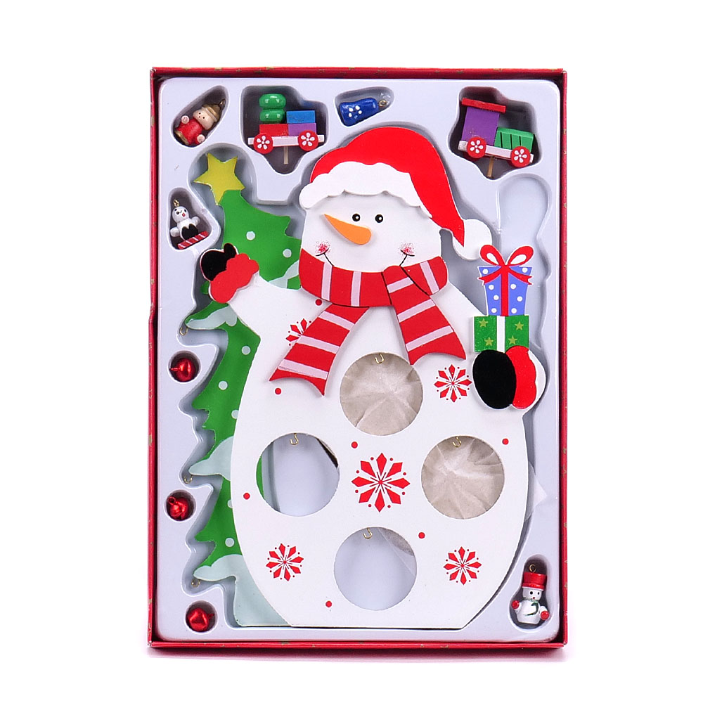 Vianočná dekorácia v podobe snehuliaka so stromčekom a mini ozdobami na zavesenie.