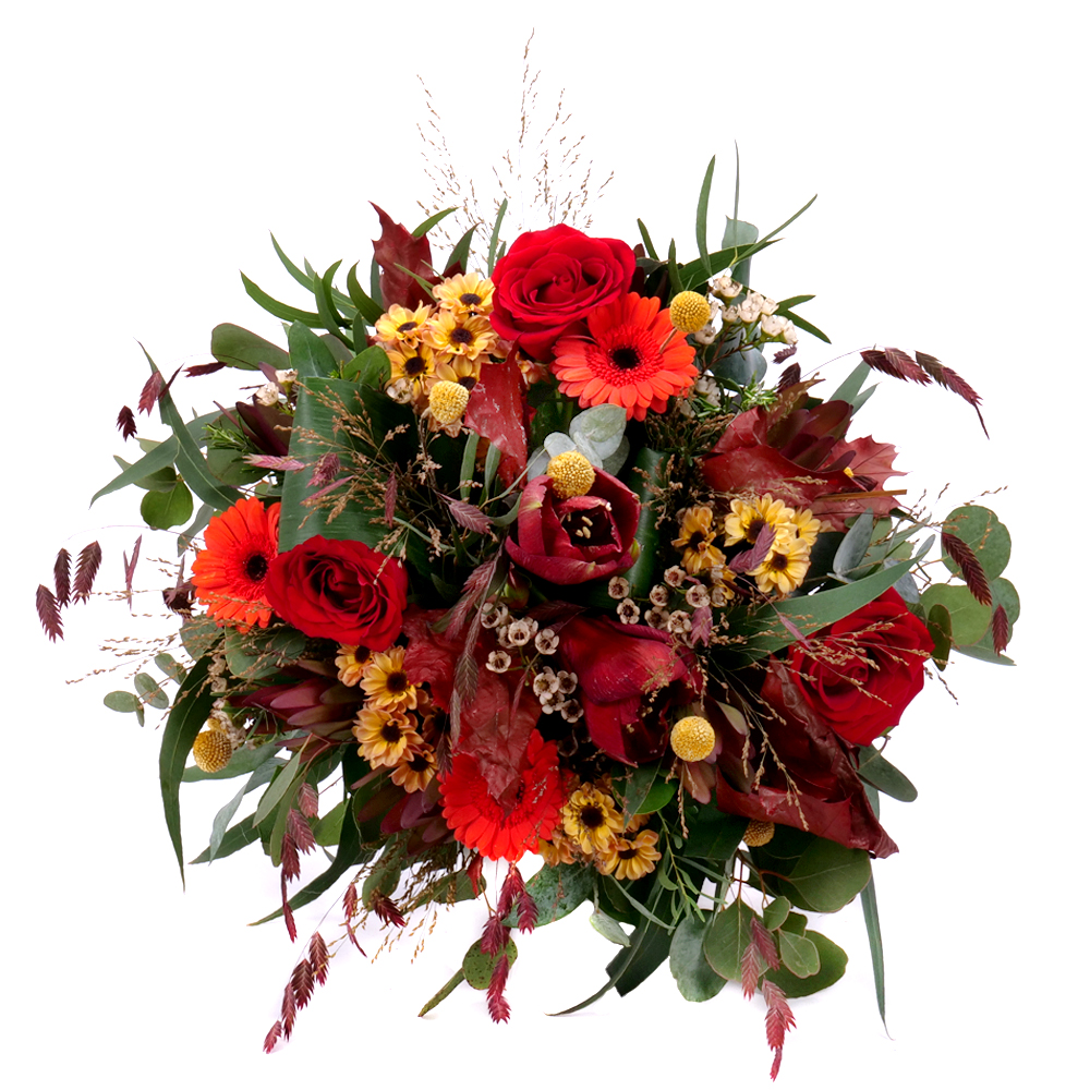 Elegantná a vznešená kytica z červených ruží, gerbier, amarylisu, prírodných doplnkov, tráv a dekoračnej zelene. Kytica je doplnená saténovou stuhou. Ideálna voľba ako darček k sviatku menín, narodením alebo k výročiu.