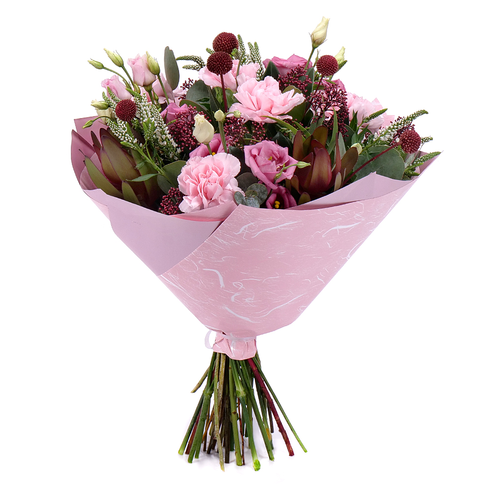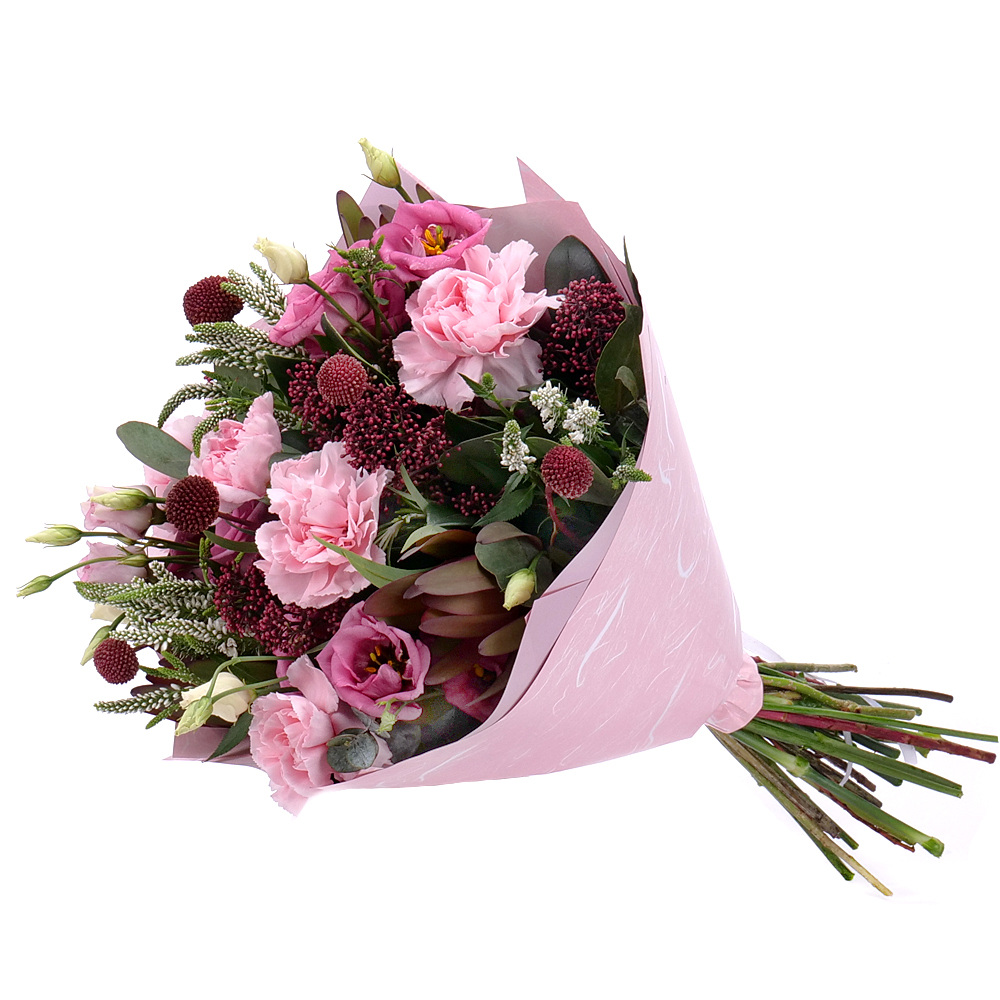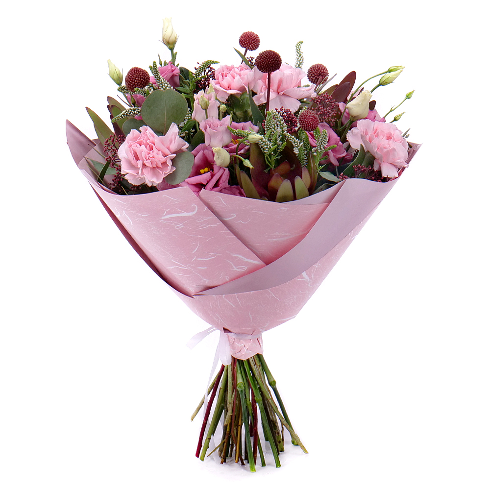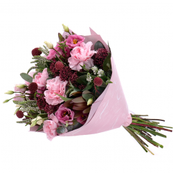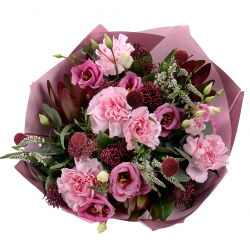 Elegantná a jemná kytica z ružových karafiátov, lisiantusu, dekoračnej zelene a craspedie. Kytica je doplnená štýlovým papierom a stuhou. Vhodný darček k sviatku narodením alebo menín. Tiež ako potešenie vo všedný deň.
