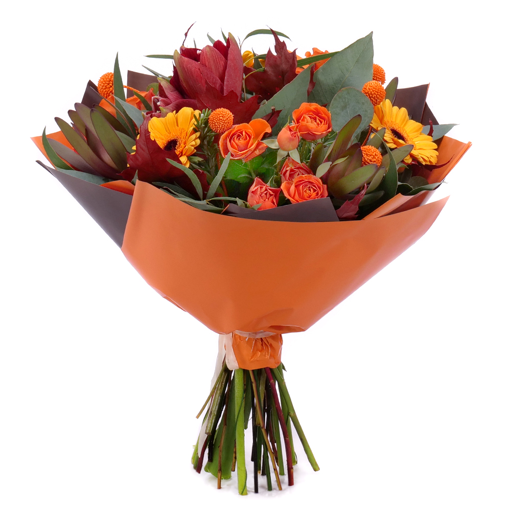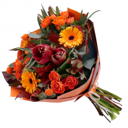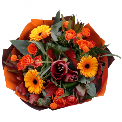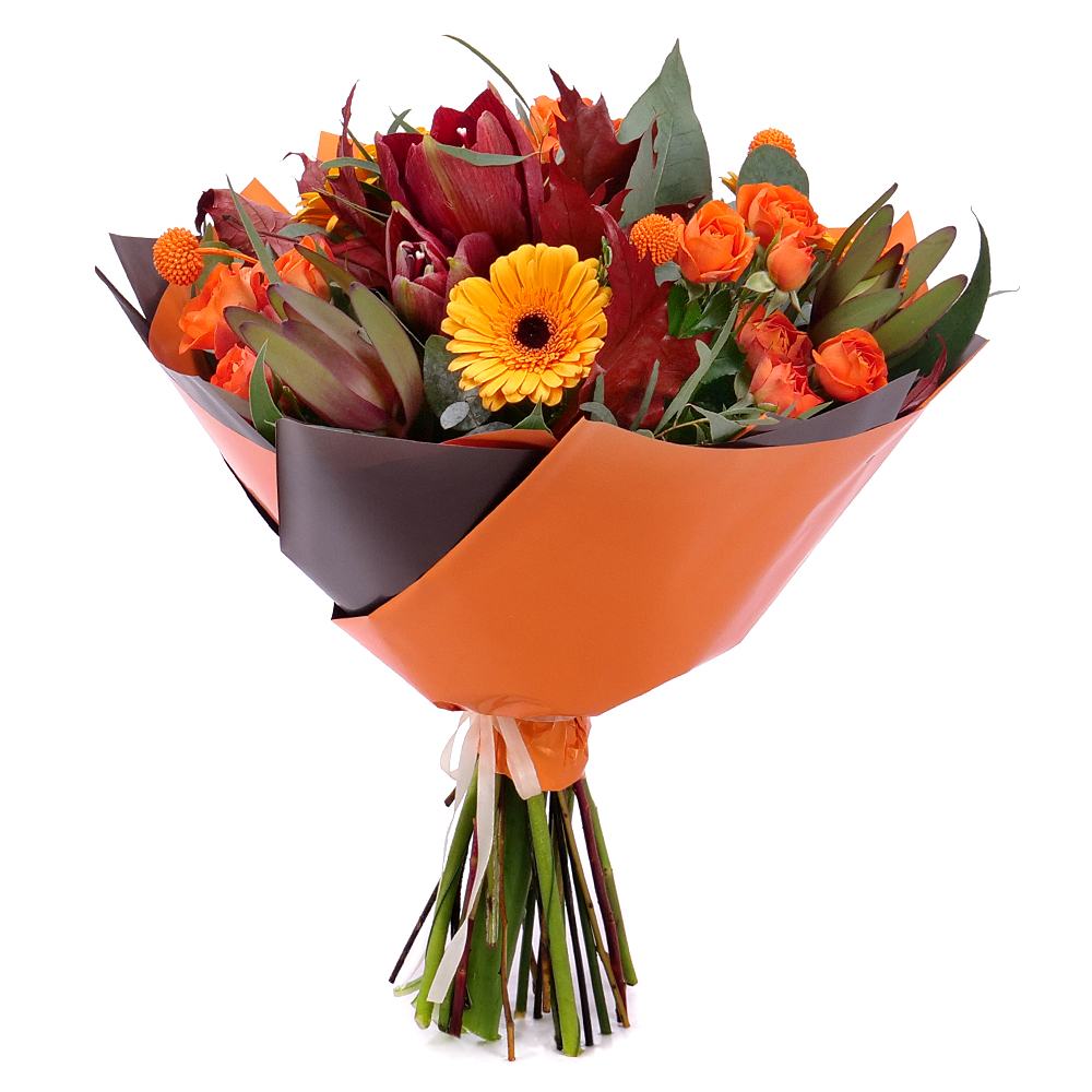 Žiarivá kytica z trsových ruží, gerbier a červeného amarylisu, ktorý dodáva kytici vznešený vzhľad. Kytica je doplnená o dekoračnú zeleň a papier.
