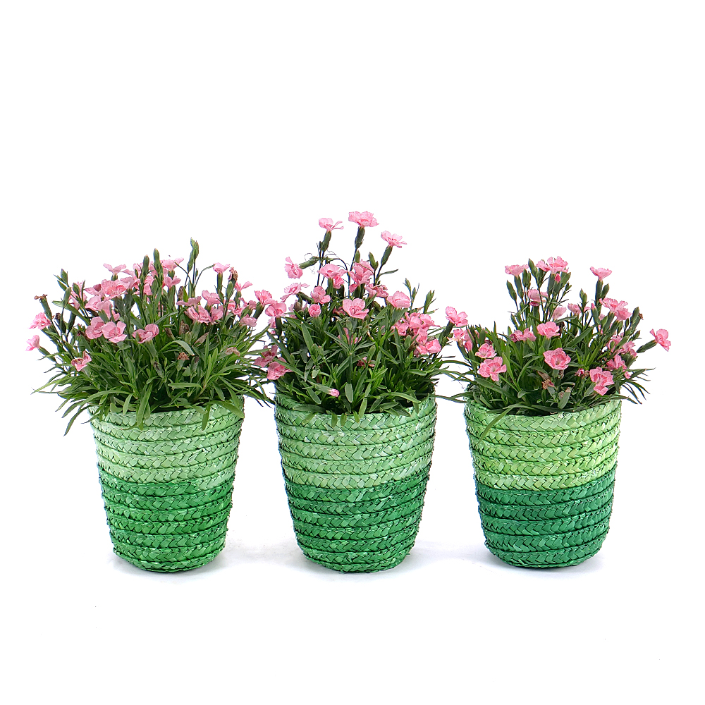 Živé klinčeky (dianthus) - 3 ks v prútenom obale. Klinčeky sú trvalky, pestujeme ich v záhonoch, skalkách či záhradách. Darí sa im aj v črepníku v kombinácii aj s inými rastlinami alebo bylinkami. Pekne skrášlia terasu či balkón. Majú radi priepustnú pôdu a slnečné svetlo.