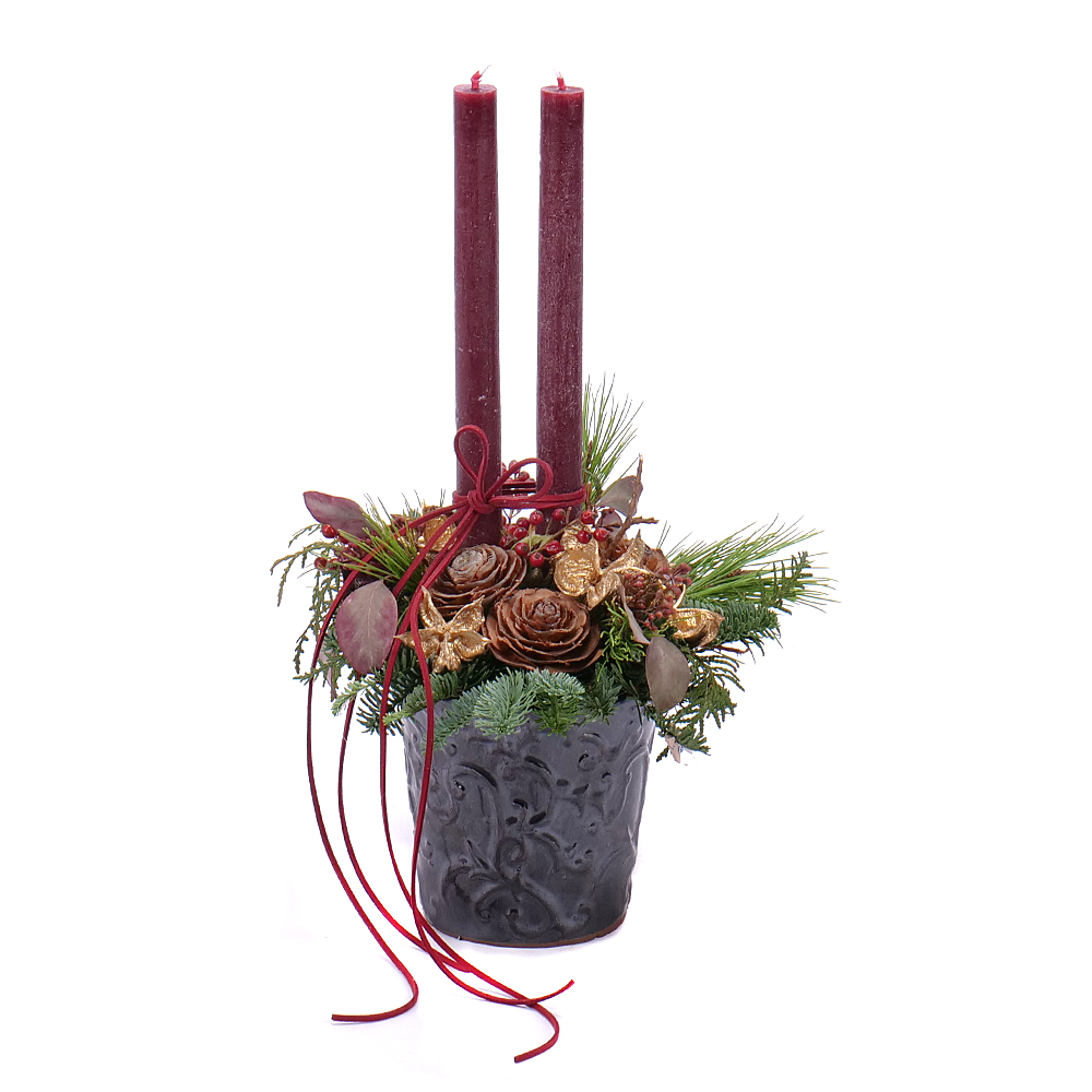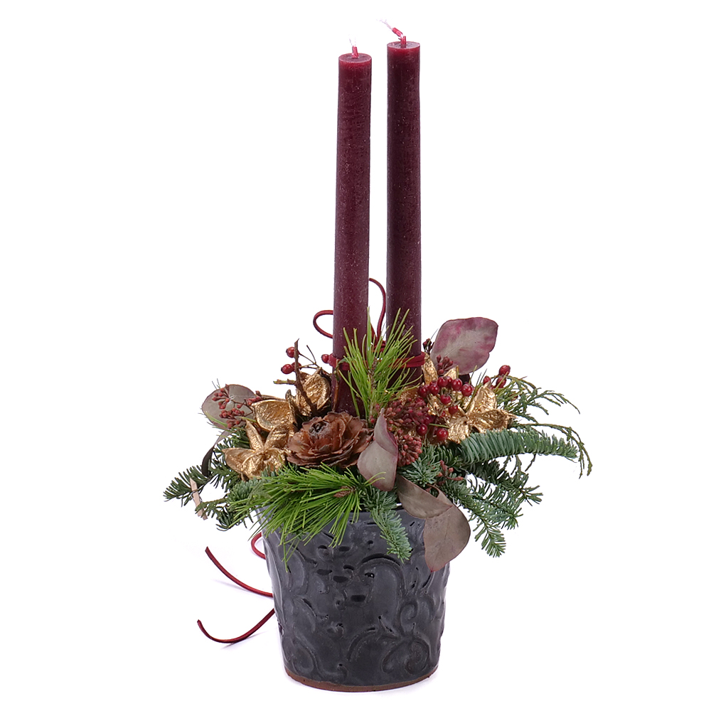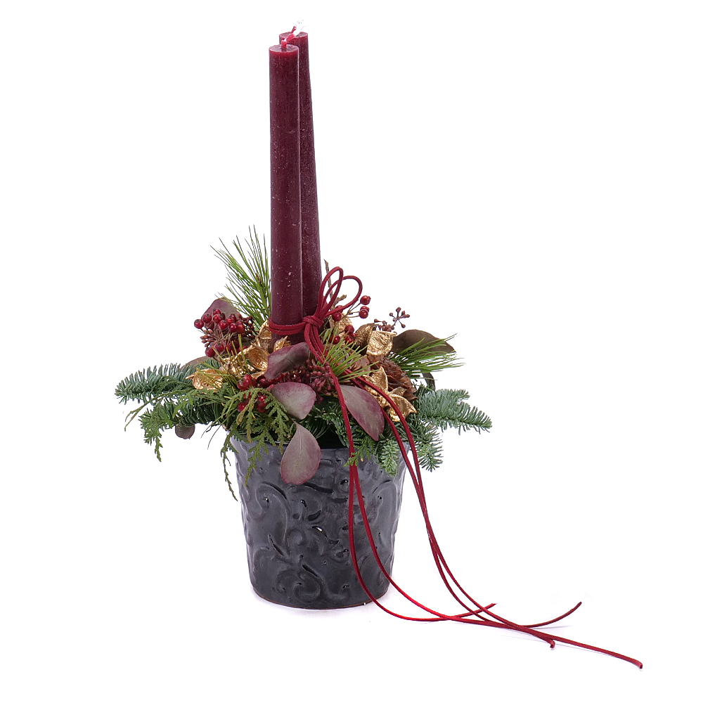 Sviatočný vianočný aranžmán v keramickom obale so živou čačinou, prírodnými materiálmi a ozdobnými plodmi v hnedej a zlatej farbe. Aranžmán je doplnený dekoračnou stuhou a 2 ks bordových sviečok, ktoré sú súčasťou aranžmánu.