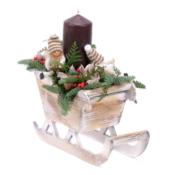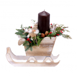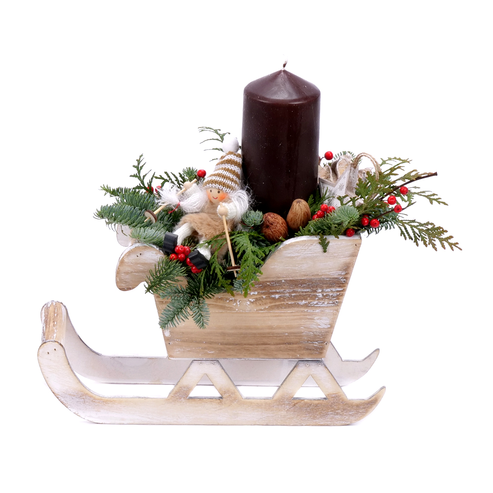NOVÉ Vianočný aranžmán drevené sane hnedá sviečka