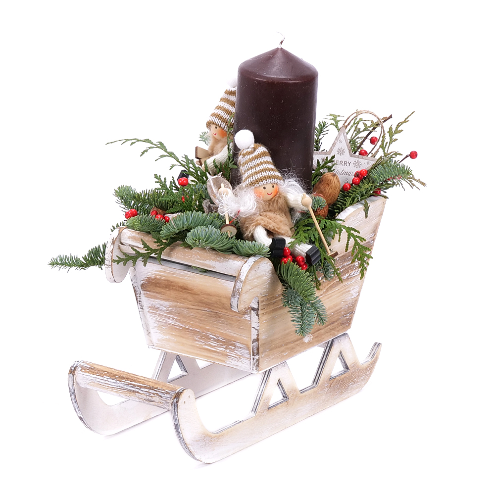 Zimný aranžmán v podobe drevených sánok s mini postavičkami, neopadavou čačinou, prírodnými doplnkami a hnedou sviečkou. Vhodná dekorácia na vianočné obdobie pre Vás alebo Vašich drahých.
