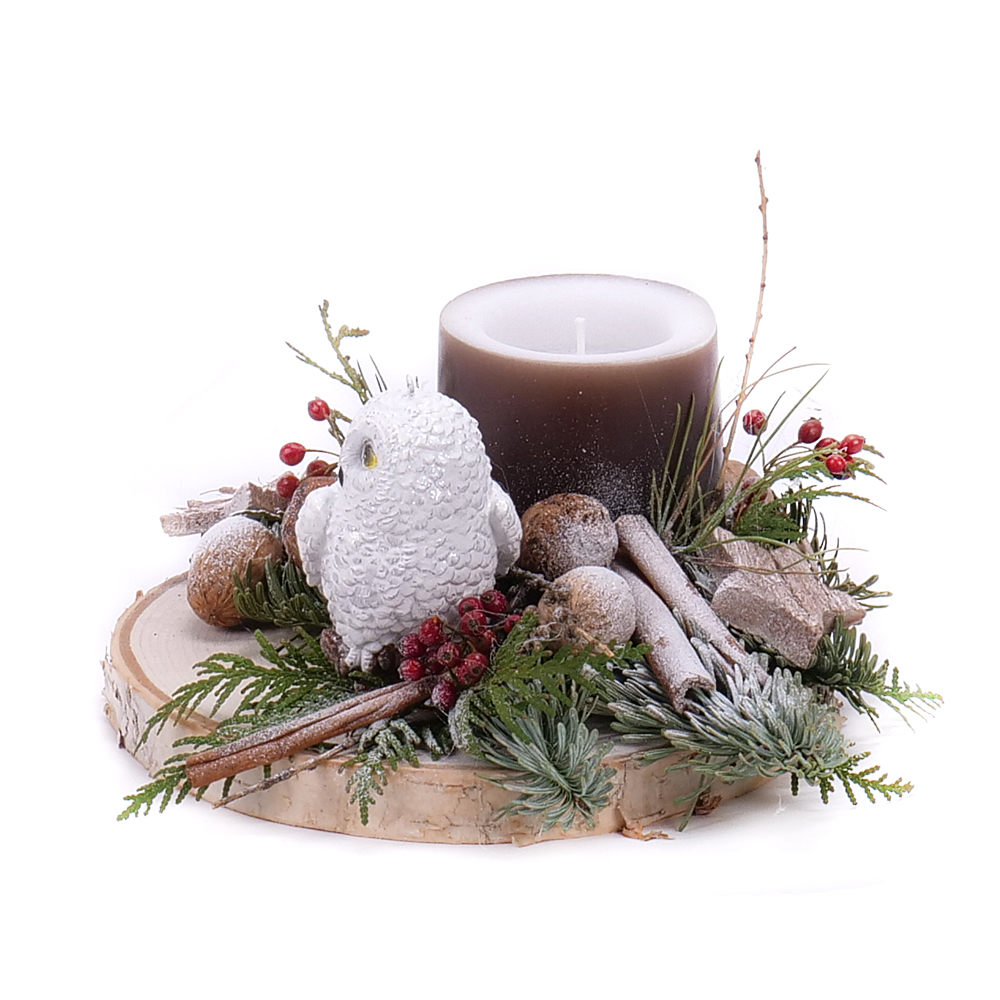 Sviatočný aranžmán na vianočné obdobie na drevenom podklade so sviečkou, prírodnými materiálmi, živou neopadavou čačinou a keramickou sovou. ... Viac