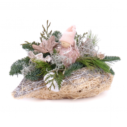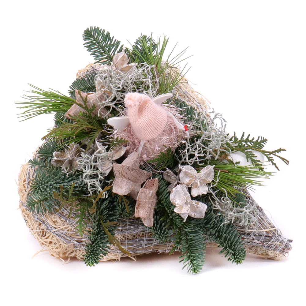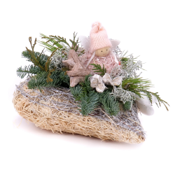 Zimný aranžmán v prútenom srdci so živou čačinou, prírodnými materiálmi a ružovým mini anjelom. ... Viac